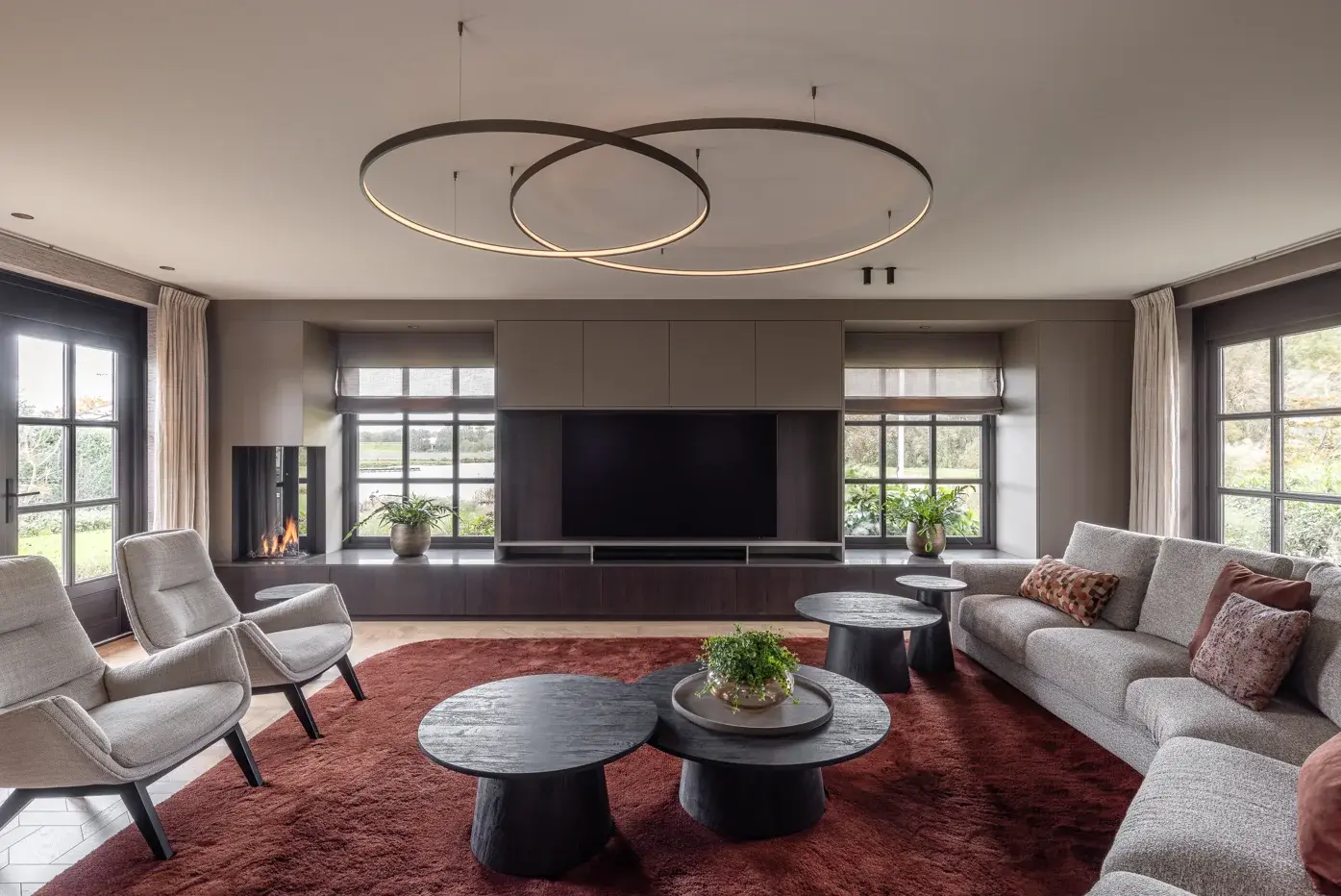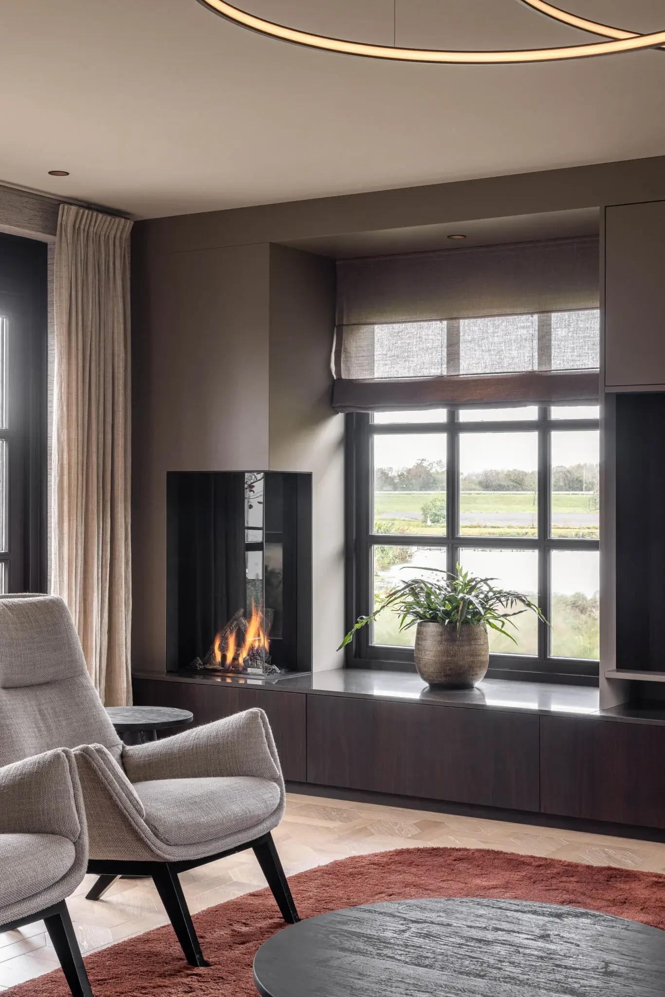 In dit huis zijn de schuine wanden en hoeken geen lastige puzzelstukken geworden, maar juist de basis van een slimme indeling. Met de uitbouw kreeg de woning extra ruimte, zonder dat de symmetrie verloren ging. Een opvallend detail is de transformatie van de kozijnen, van licht naar donker. Binnen is rondom diezelfde ramen gewerkt met maatwerk. Een royale kast met haard, ruimte voor tv en platenspeler, en een ronde hoekbank zorgen voor optimalisatie van de ruimte woonkamer. Balans, opbergruimte én een kloppende verhouding met de hoge ramen.