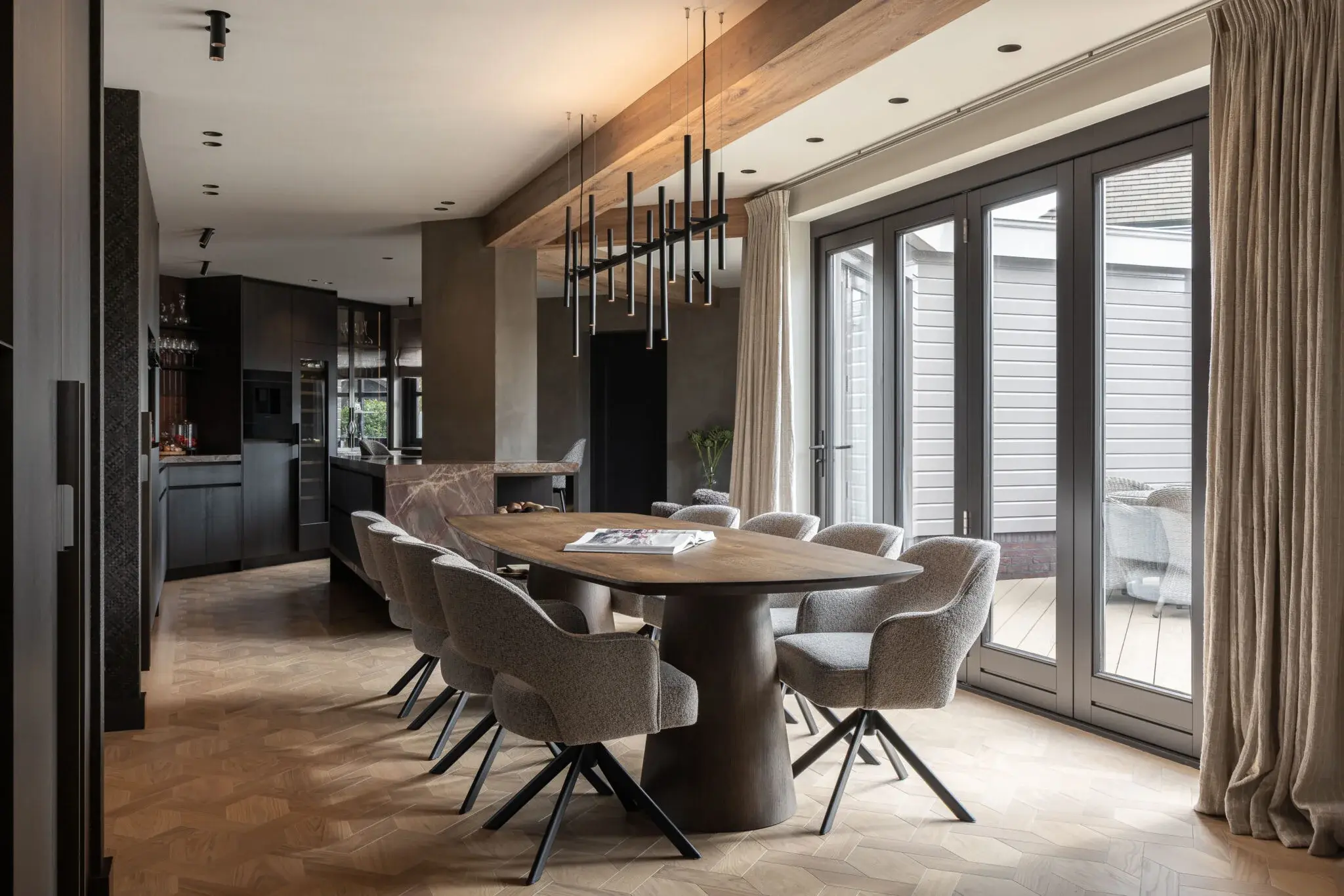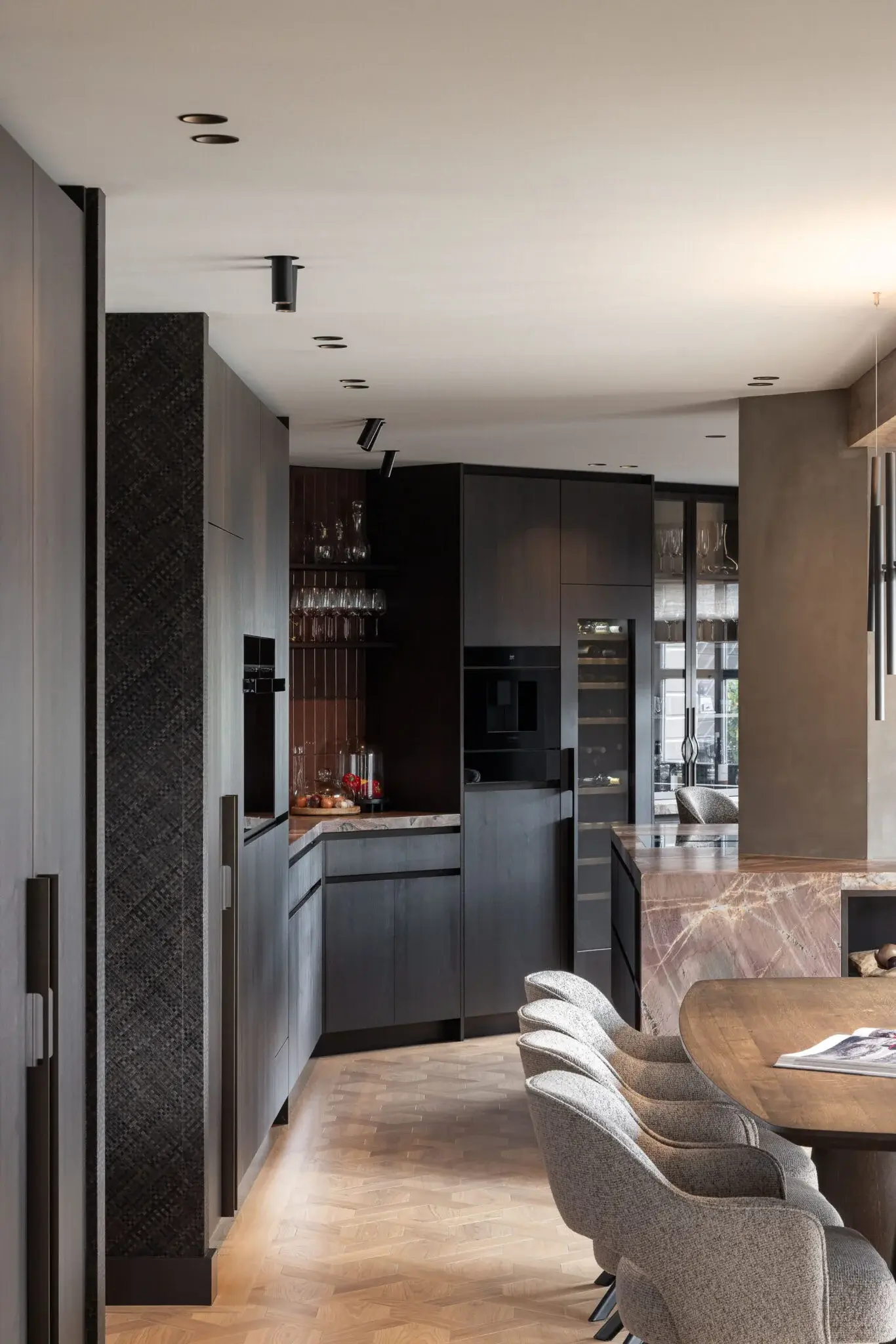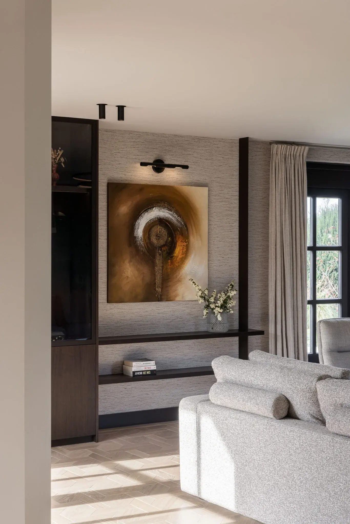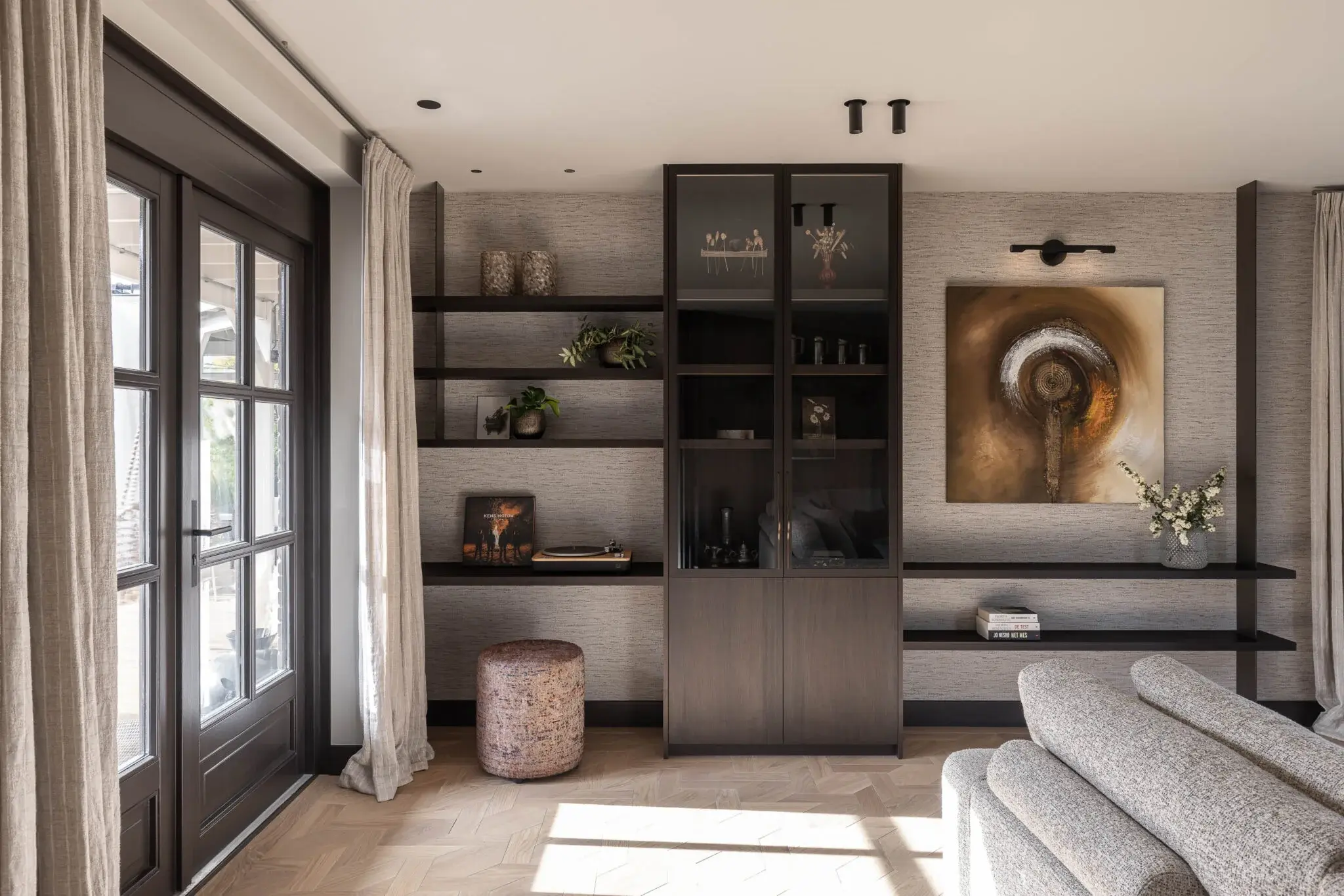 De vloer maakt het plaatje compleet: maison weave parket, die door het speelse patroon een onverwachte twist geeft aan de ruimte. Warm kleur gebruik met zacht rode accenten maken het interieur toegankelijk en geschikt voor het hele gezin. Het bijzondere keukeneiland, met open nis en over gehele breedte doorlopend steen, biedt met zijn ronde bar ruimte voor borrelen. Vlakbij de haard en met wijn faciliteiten nabij. Het ontworpen maatwerk geeft zoveel mooie details; de dunne stalen panelen, het gevlochten behang wat doorloopt van de stalen deuren, naar wand naar de achterwand van de open nis en een compleet wandvullend tv-meubel met ingebouwde haard.