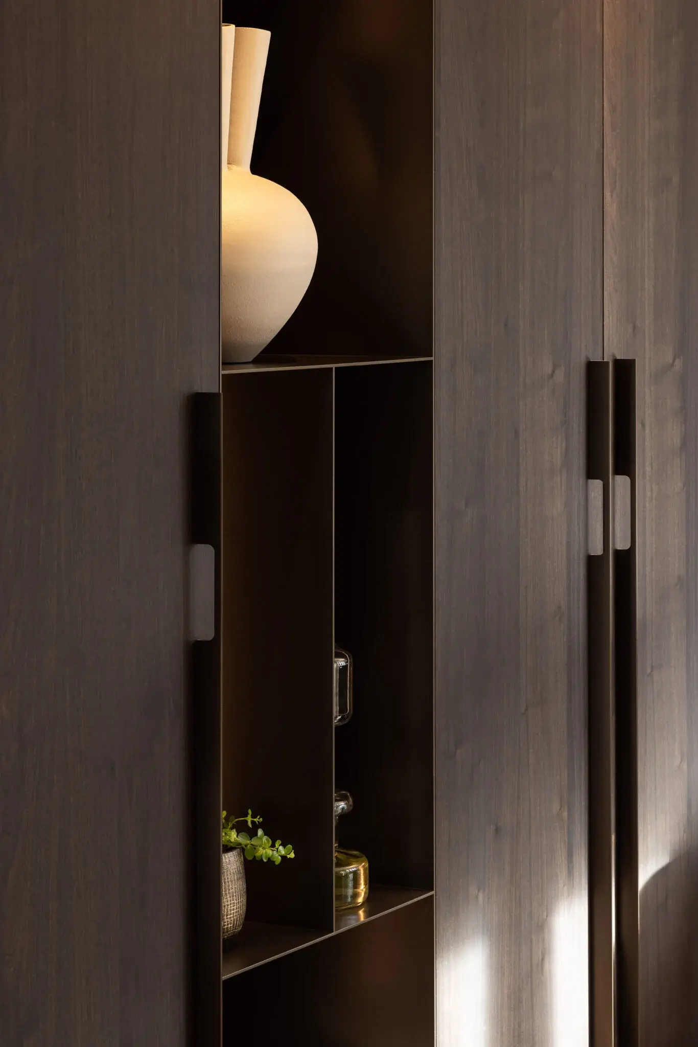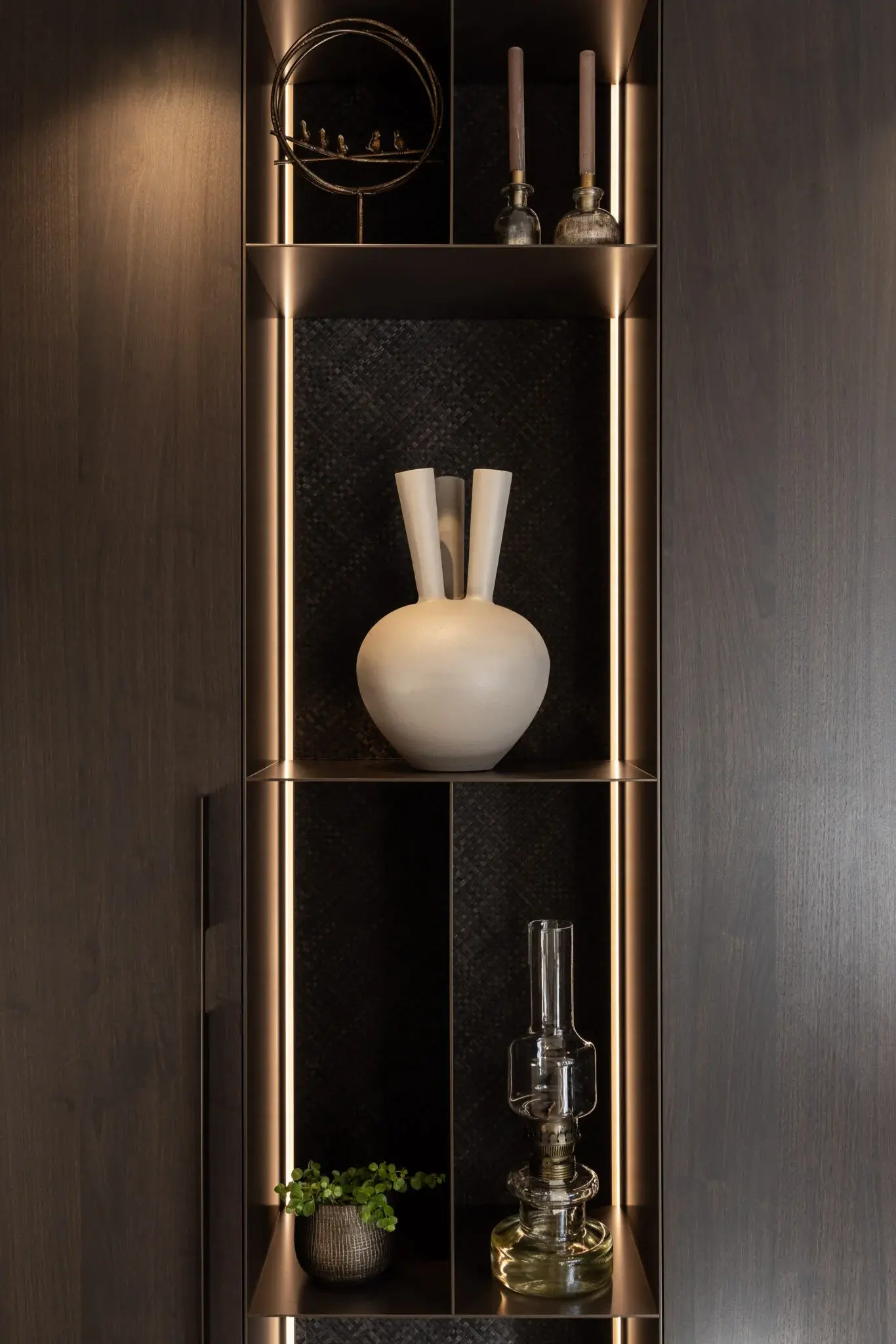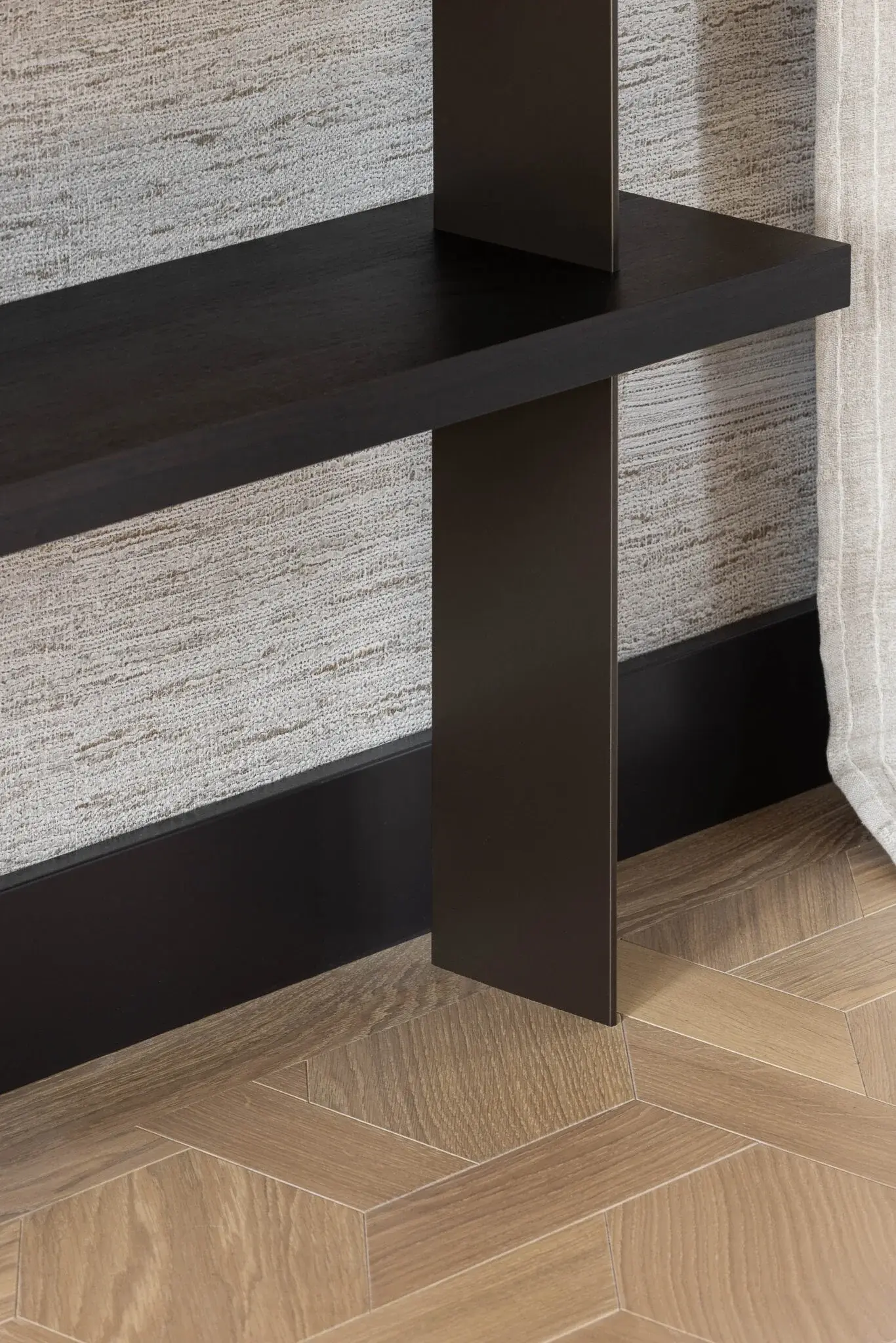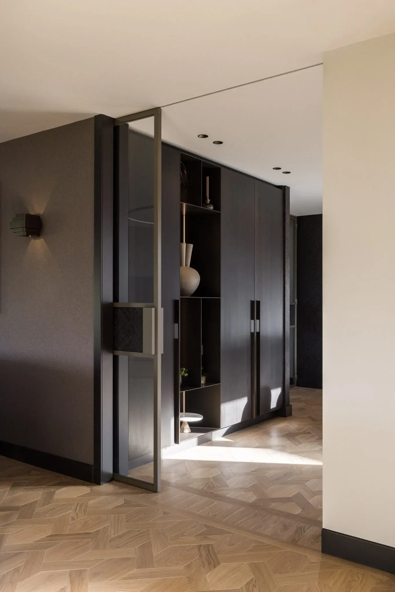 De vloer maakt het plaatje compleet: maison weave parket, die door het speelse patroon een onverwachte twist geeft aan de ruimte. Warm kleur gebruik met zacht rode accenten maken het interieur toegankelijk en geschikt voor het hele gezin. Het bijzondere keukeneiland, met open nis en over gehele breedte doorlopend steen, biedt met zijn ronde bar ruimte voor borrelen. Vlakbij de haard en met wijn faciliteiten nabij. Het ontworpen maatwerk geeft zoveel mooie details; de dunne stalen panelen, het gevlochten behang wat doorloopt van de stalen deuren, naar wand naar de achterwand van de open nis en een compleet wandvullend tv-meubel met ingebouwde haard.