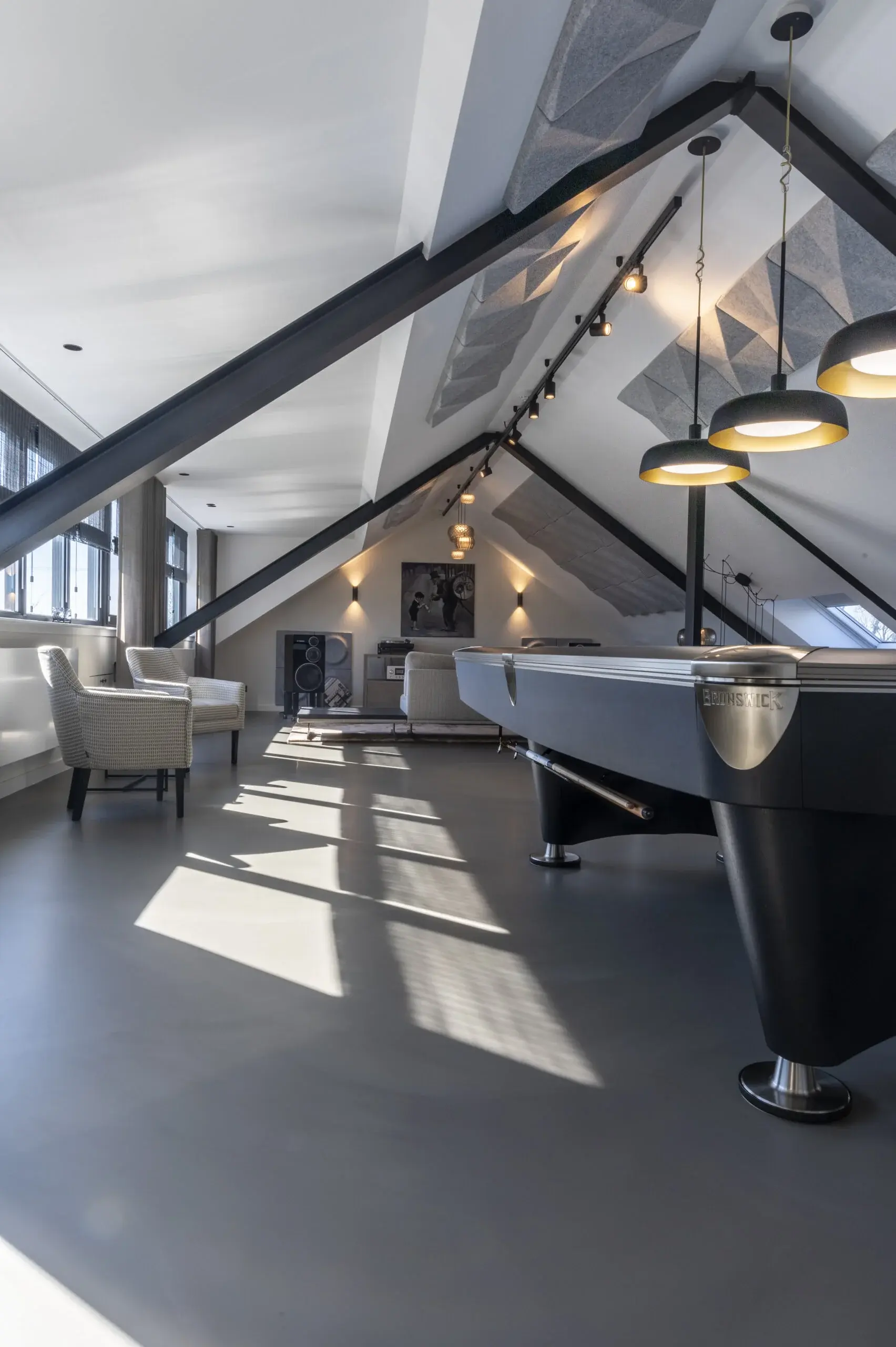 De opdrachtgever is ook muzikaal aangelegd en houdt van poolen. Daarom mochten we de bovenverdieping omtoveren tot een ware mancave.